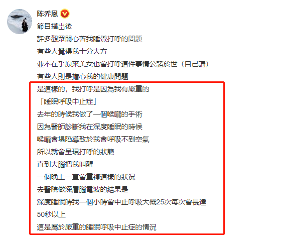 1月6日,陳喬恩在社交媒體上自爆患有嚴重的睡眠呼吸中止癥