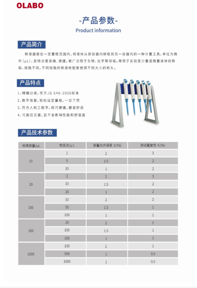 國產OLABO,B系列單道可調式移液器100-1000μl量程:100-1000μl,精確分液,數字視窗,符合人體工學,握姿舒適